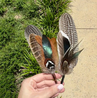 Elevate your hat game with this feather accent, featuring natural guinea and iridescent duck feathers. Finished with a ribbon on the tail, it tucks neatly into any hat band for a secure fit. Perfect for adding personality to your favorite hat—hat not included. Make a statement with this unique accessory!