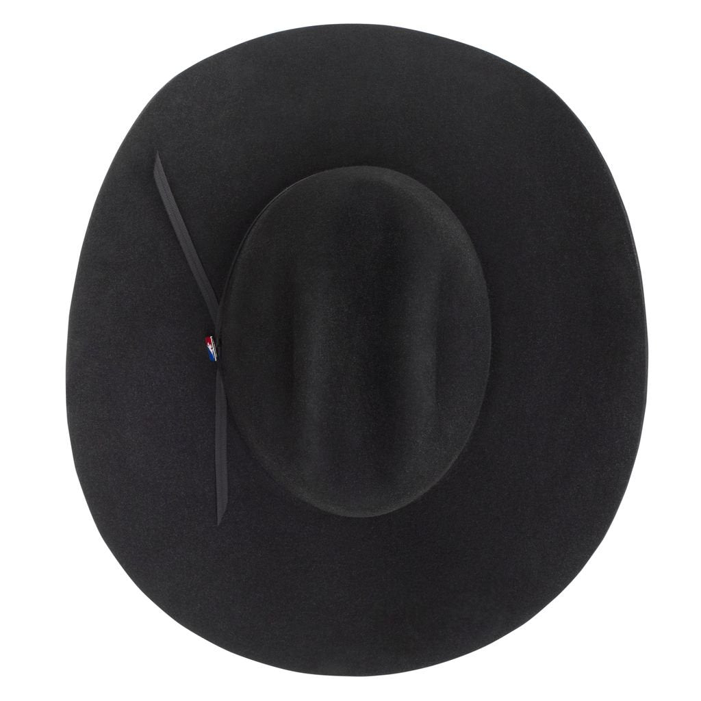 The Statler from the Wright Western Collection is a 4X wool cowboy hat in classic black. It features a 4 5/8" cattleman crown, 4 1/4" brim, and a genuine leather sweatband. The black ribbon hatband is finished with the Wright Western logo in red, white, and blue.